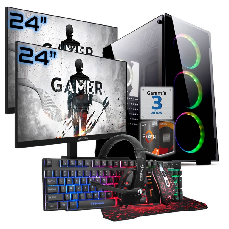 PC Gamer AMD Ryzen 7 5700G RAM 32Gb Ddr4 Ssd Nvme 1Tb 2 Monitores 24" 100Hz Wifi Bt Teclado Mouse Auricular MousePad W11